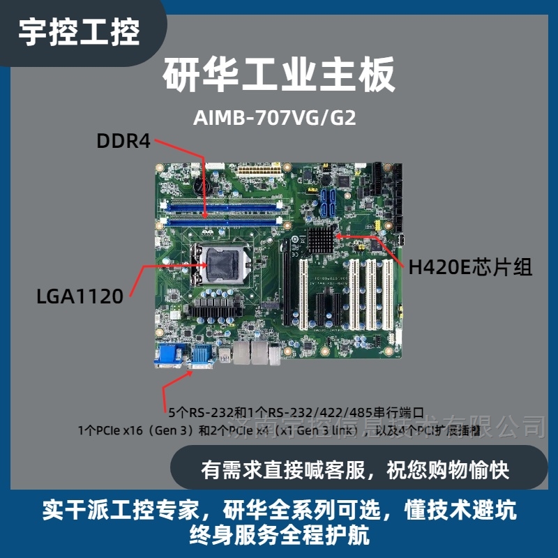 研华工控机主板AIMB-707VG/G2Intel®第10代Core™i9/i7/i5/i3和Pentium®/Celeron®处理器,采用H420E芯片组双通道(非ECC)DDR4 2400/2666/2933,最高64 GB支持VGA和DVI显示M.2、SATA 3.0、USB 3.2、双GbE5个RS-232和1个RS-232/422/485串行端口