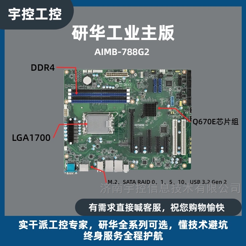 AIMB-788G2 研华 12-14 代酷睿工控主板Intel® 12/13/14代Core™ i9/i7/i5/i3 & Pentium®/Celeron®处理器 Q670E芯片组4个DIMM插槽,最高128 GB DDR4 3200三显DP/HDMI/VGA和双GbELANM.2、SATA RAID 0、1、5、10、USB 3.2 Gen 2